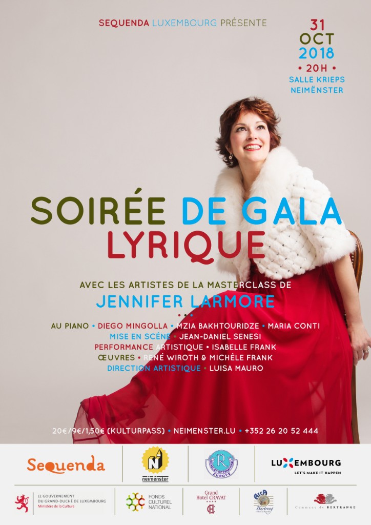 À l’issue de la dixième édition des Masterclass organisées par Sequenda, la diva américaine Jennifer Larmore, grande mezzo-soprano à la carrière exceptionnelle, sera accompagnée par quinze jeunes chanteurs lyriques extrêmement talentueux sélectionnés dans le monde entier. Le répertoire est composé de musiques de Mozart, Rossini, Verdi, Puccini, Bizet, Strauss… La mise en espace a été conçue par Jean-Daniel Senesi, avec des œuvres de Michèle Frank, René Wiroth et Isabelle Frank.