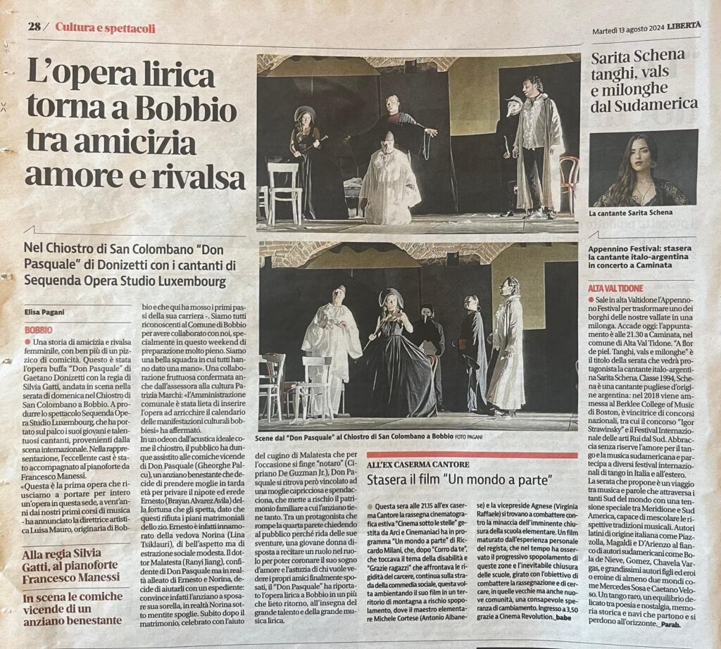 Voici un article qui relate le spectacle de Don Pasquale à Bobbio, dans la région Émilie-Romagne, dans le Nord-Ouest de l’Italie (à lire en italien). Hommage à Guy de Muyser Un nouveau président pour Sequenda