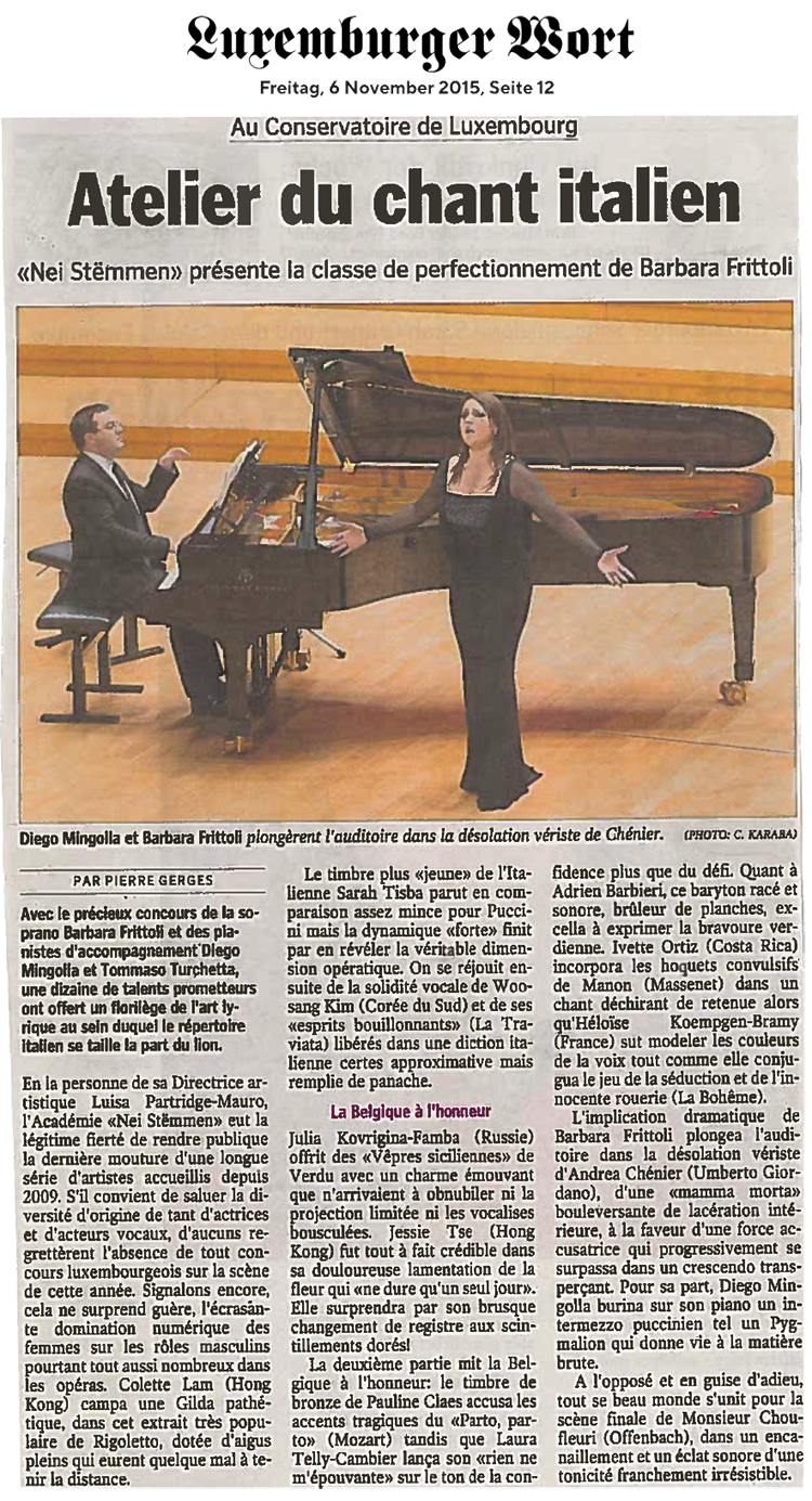 Un article élogieux sur le concert de la Masterclass Barbara Frittoli est paru dans le quotidien Luxemburger Wort.
